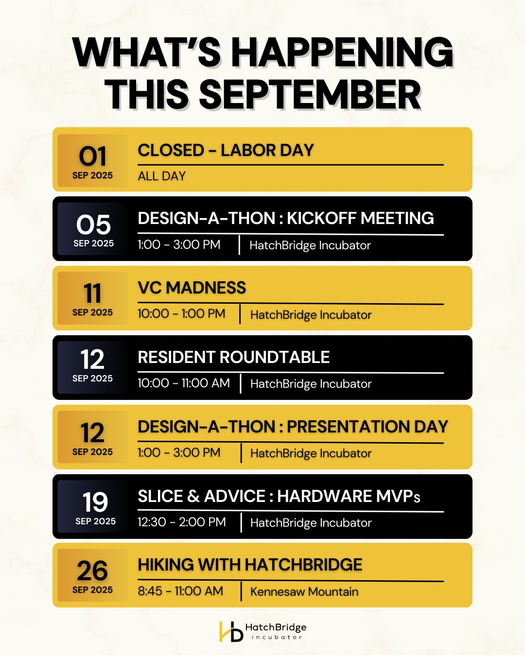 🗓️ September 19 12:30-2pm | 📍 HatchBridge Incubator (1111 Chastain) | 🍕 Pizza served