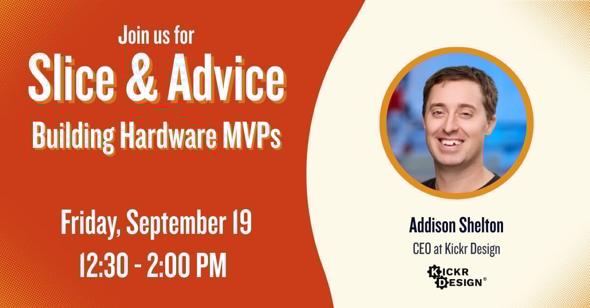 Hosted by Addison Shelton, Join us for a conversation with Addison Shelton, CEO of Kickr Design and former engineer at Apple and Sila Nanotechnologies. With a background in mechanical engineering and years of experience bringing ideas to life, Addison will share practical insights on taking hardware concepts from prototype to MVP.